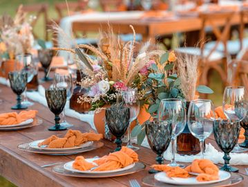 Table, tablecloth, table runner, 12 candles, two small flower centerpieces, one large flower centerpiece, crystal garland, two charger plates, two regular plates, two napkins, two napkin rings, two champagne glasses, two forks, two knives, two Chiavari chairs,